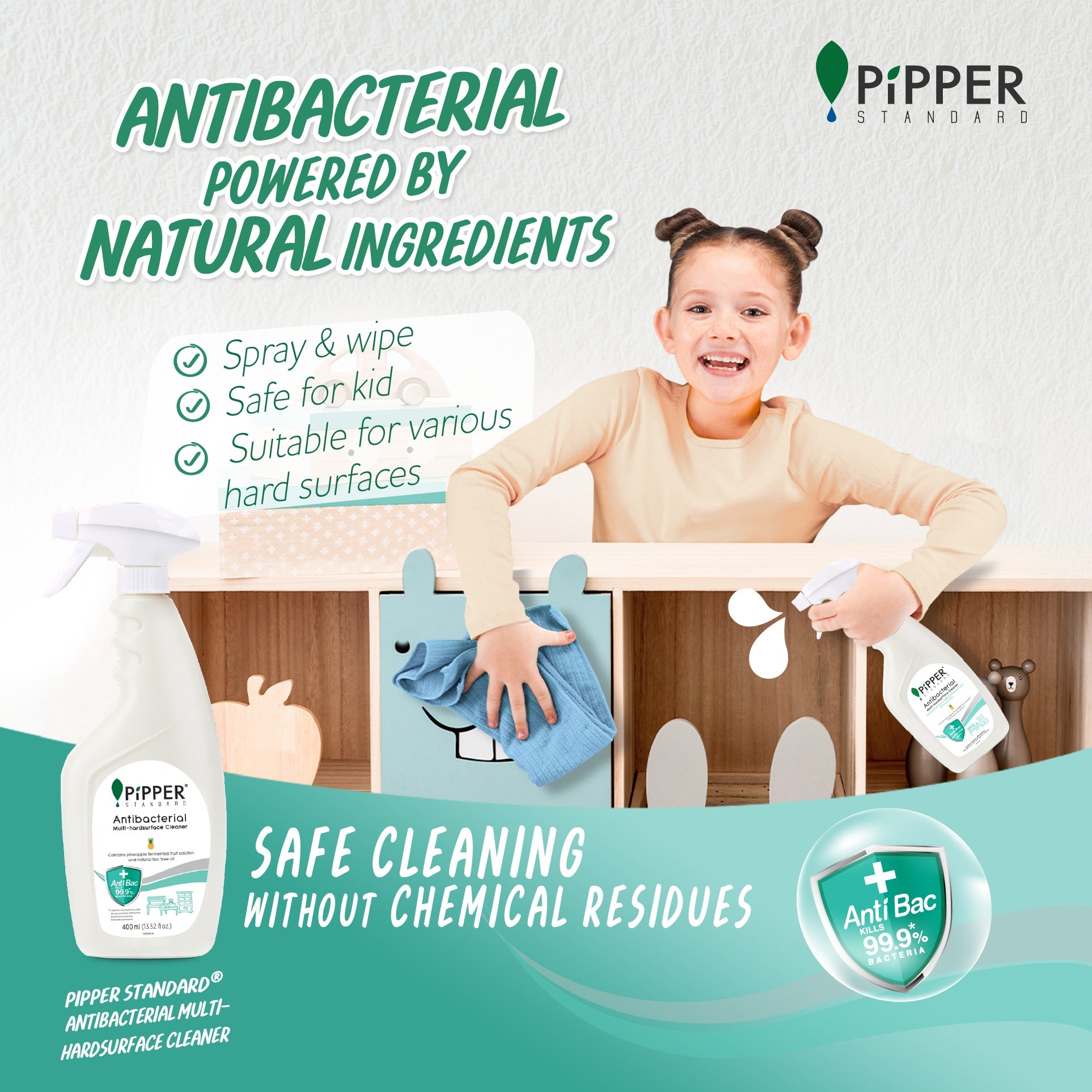 Our natural multi-hard surface cleaner is effective for cleaning in common things such as phones, furniture and mirror etc. It is suitable for various hard surfaces; wood, laminate, ceramic plastic, steel etc. This product also effectively kills 99.9%* of bacteria. Its pleasant scent comes from natural essential oil.